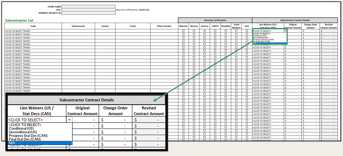 The 'Lien Waivers (US) / Stat Dec (CAN)' column will inform what type of Lien Waiver (US) or Statutory Declaration (CAN) is provided per Subcontractor. The GC will select which document will be provided along with the referenced Payment Request for each Subcontractor. If a Subcontractor is not receiving payment with this Payment Application, they are to select 'N/A'.