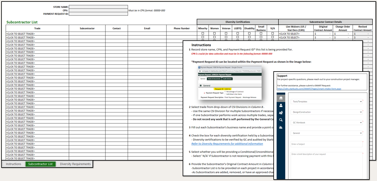 The Subcontractor List Excel workbook contains detailed instructions on how to fill out the Subcontractor List, where to go for support, along with an outline of Diversity Requirements.