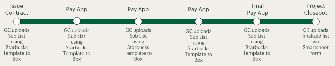 A Subcontractor List is to be provided on each project in accordance with the Project Authorization Form. As Subcontractors are added, removed, or have an approved change in contract value, an updated Subcontractor List is to be submitted with the subsequent Payment Application. The Starbucks standard Subcontractor List Template is the only format to be accepted.